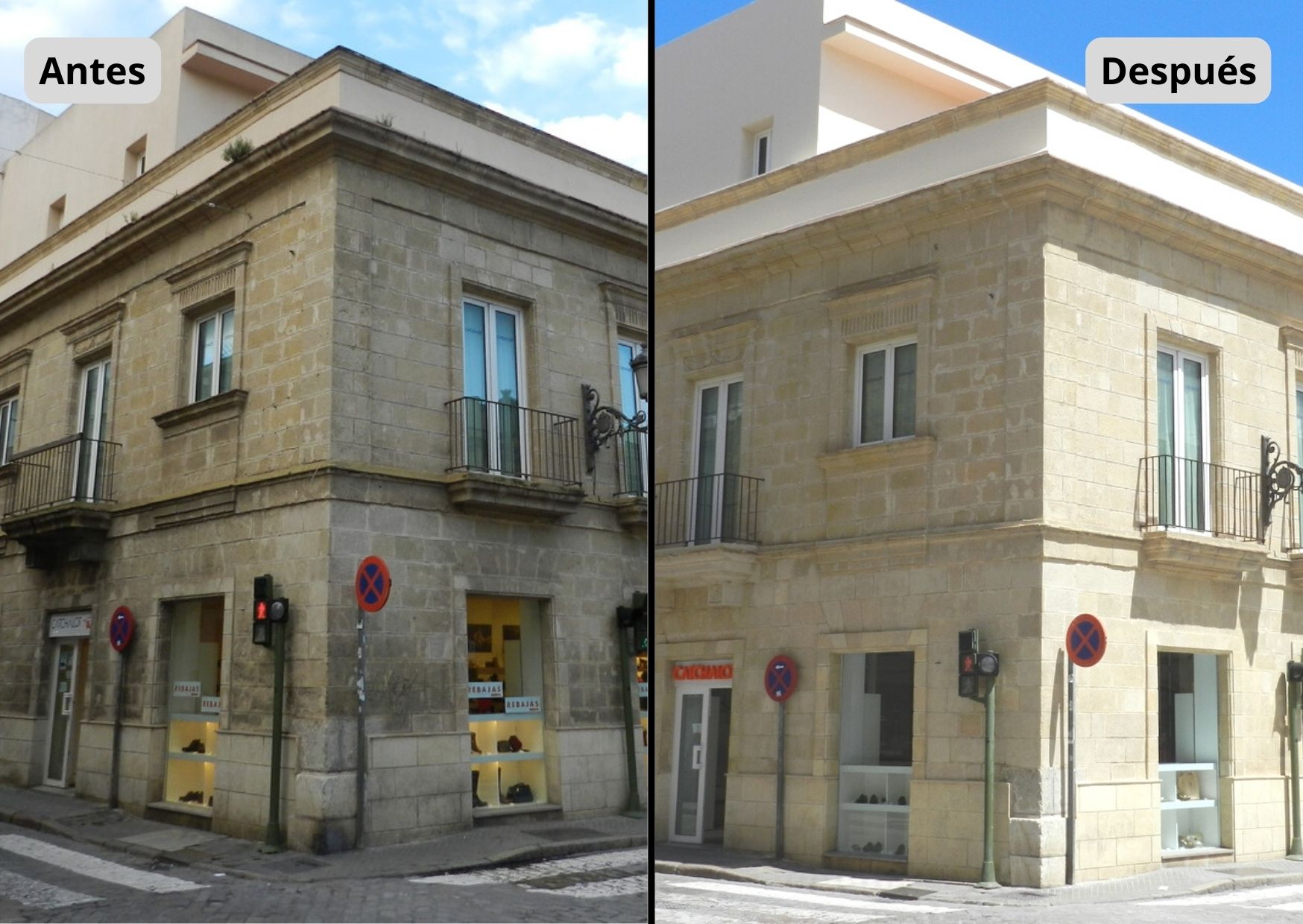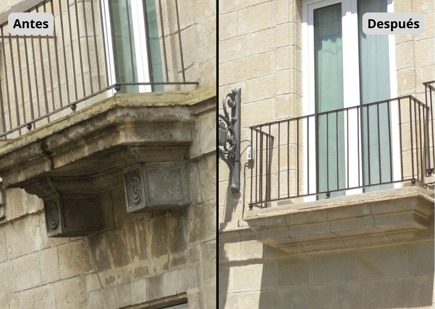 Una vez limpia la fachada, hemos reconstruido las zonas deterioradas del soporte pétreo tanto en cornisas, vuelos de balcones y en frentes de la misma fachada, como en el llagueado de la piedra en los viejos muros y en el ladrillo de los vuelos, para así evitar posibles filtraciones en estos últimos, con mortero eco-compatible de cal natural pura NHL 3.5, conforme a la norma EN 459-1. Clasificado G / Clase M 5 conforme a la norma EN 998-2. Dicho producto natural y poroso aporta una elevada transpirabilidad, dejando al muro libre para respirar, estando considerado con certificado Bio 4.